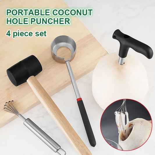4Pcs Stainless Steel Coconut Opener Set Meats Removal with Hammer Hole Puncher Planer Kitchen Tool