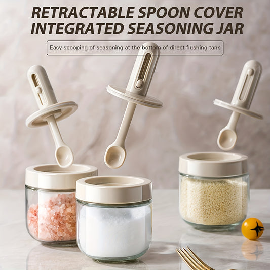 Kitchen Condiment Container Glass Spice Seasoning Jars Salt Sugar Pepper Chilli w/ Retractable Spoon