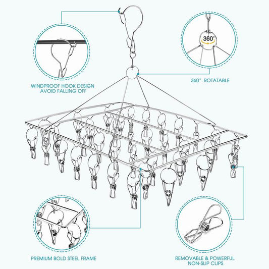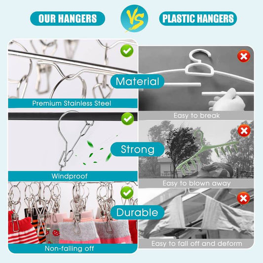 SUS304 Stainless Steel Hanger 36 Clips Peg Heavy Duty Windproof Rust-Proof Laundry Drying Rack Hanging Organiser Balcony