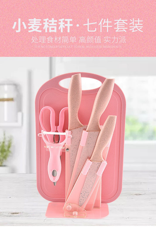 7pcs Wheat Knife Set With Cutting Board Utensils Holder 7in1 Non-Stick Stainless Steel Kitchen Cooking Knives Scissor