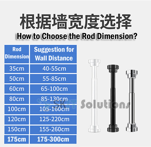 【SG Seller】Premium Black Window Curtain Shower Rod Pole, NO DRILL HOLE, Practical Stainless Steel Round Head Extendable Telescopic Curtain Rod Multifunctional Tension Rod for Bathroom, Balcony, Kitchen, Laundry, Living bedroom, Cupboard, Diameter 2.2cm,