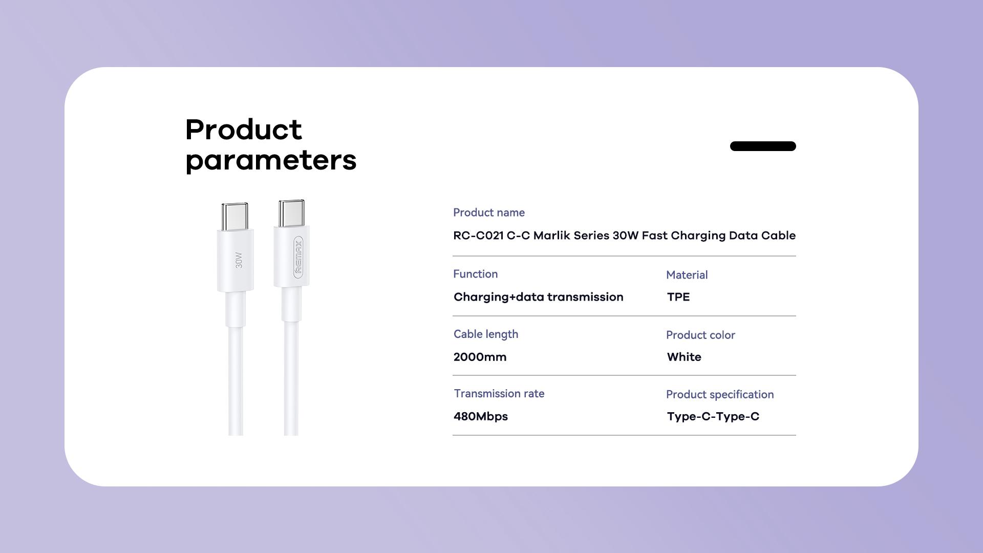 - WHAT’S IN THE BOX: 1 x Marlik Series 30W PD Fast Charging Data Cable RC-C021 C-C