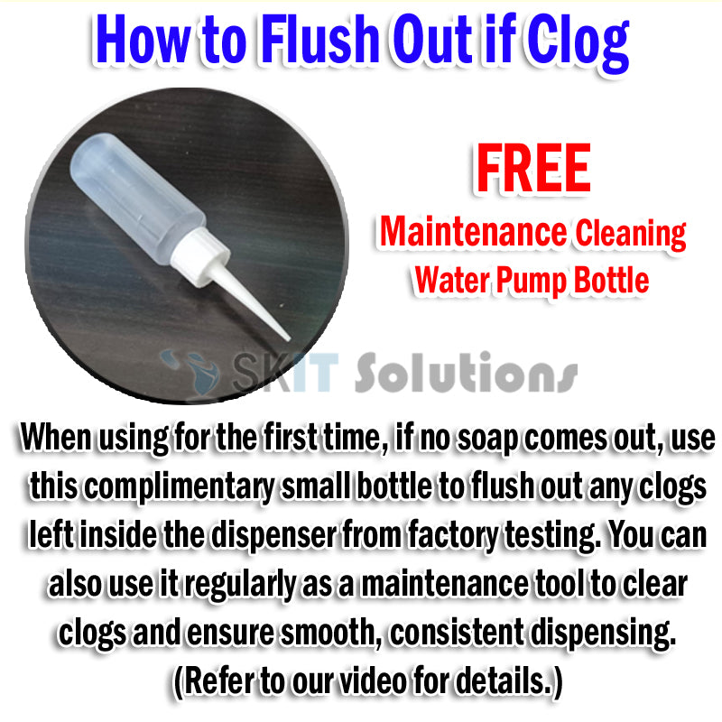 - Free Maintenance Cleaning Water Pump Bottle — When using for the first time, if no soap comes out, use this complimentary small bottle to flush out any clogs left inside the dispenser from factory testing. You can also use it regularly as a maintenance tool to clear clogs and ensure smooth, consistent dispensing. (Refer to our video for details.)