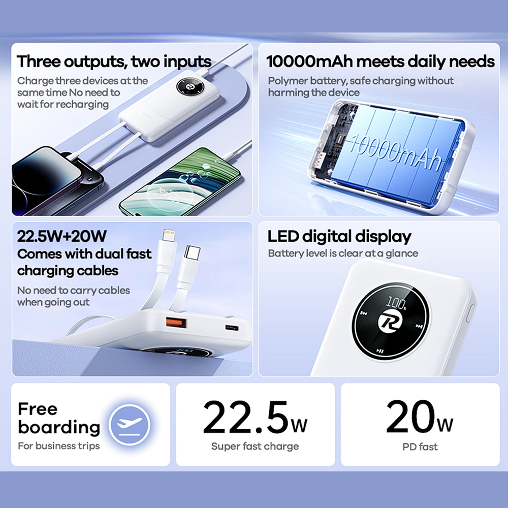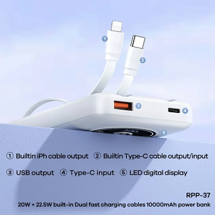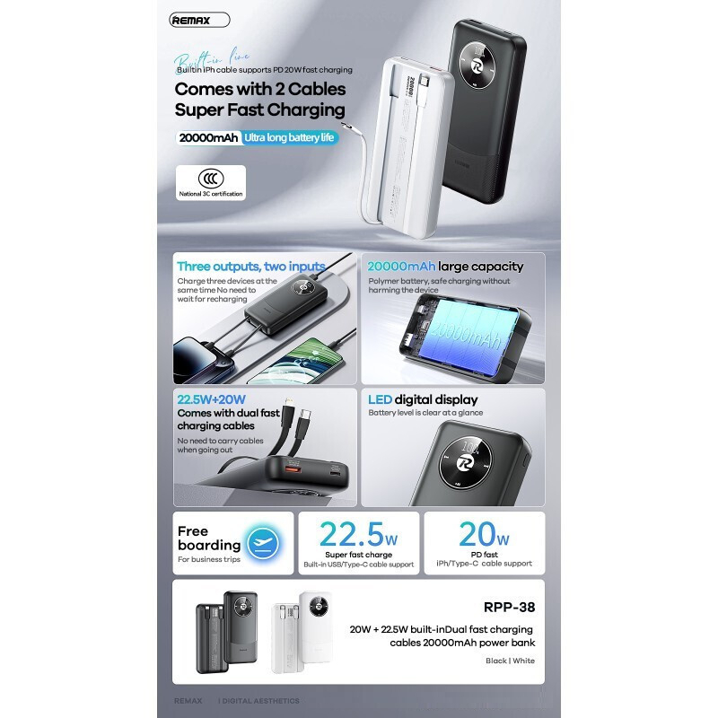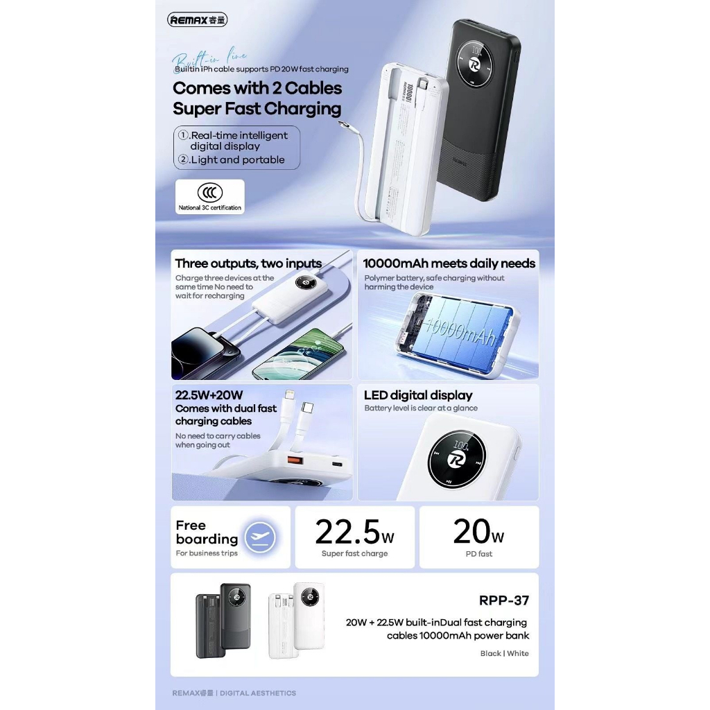 [3CCC] REMAX RPP-37 10000mAh / RPP-38 20000mAh Power Bank 20W+22.5W Fast Charging Portable Charger Built-In Dual Cable