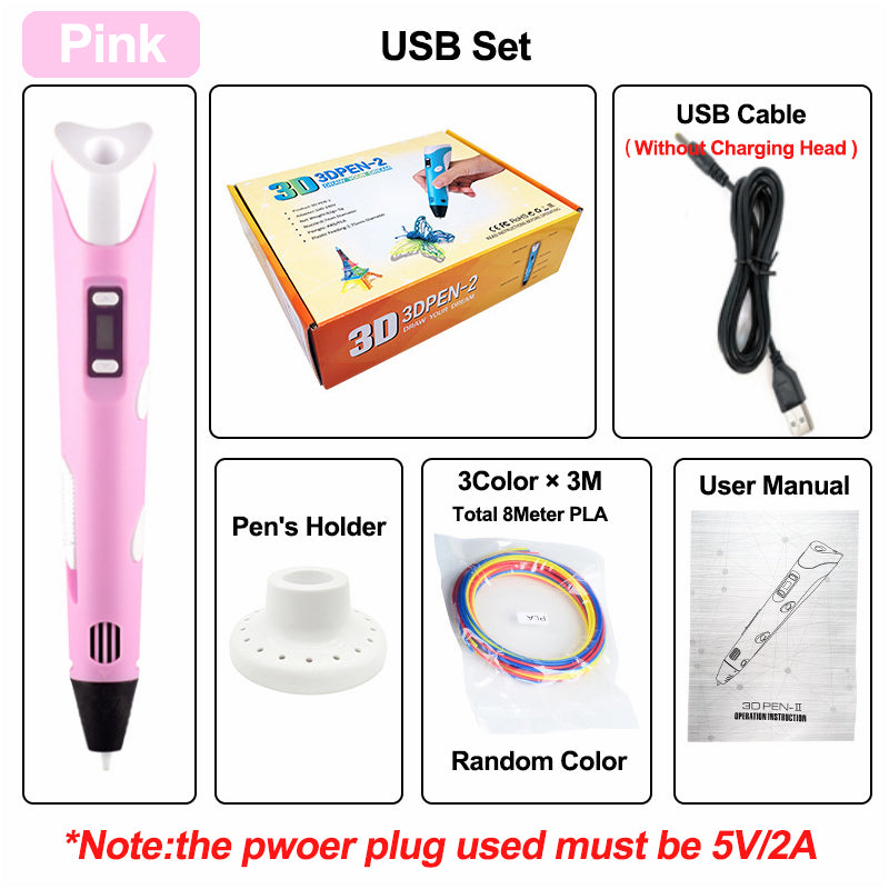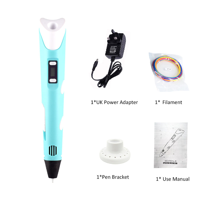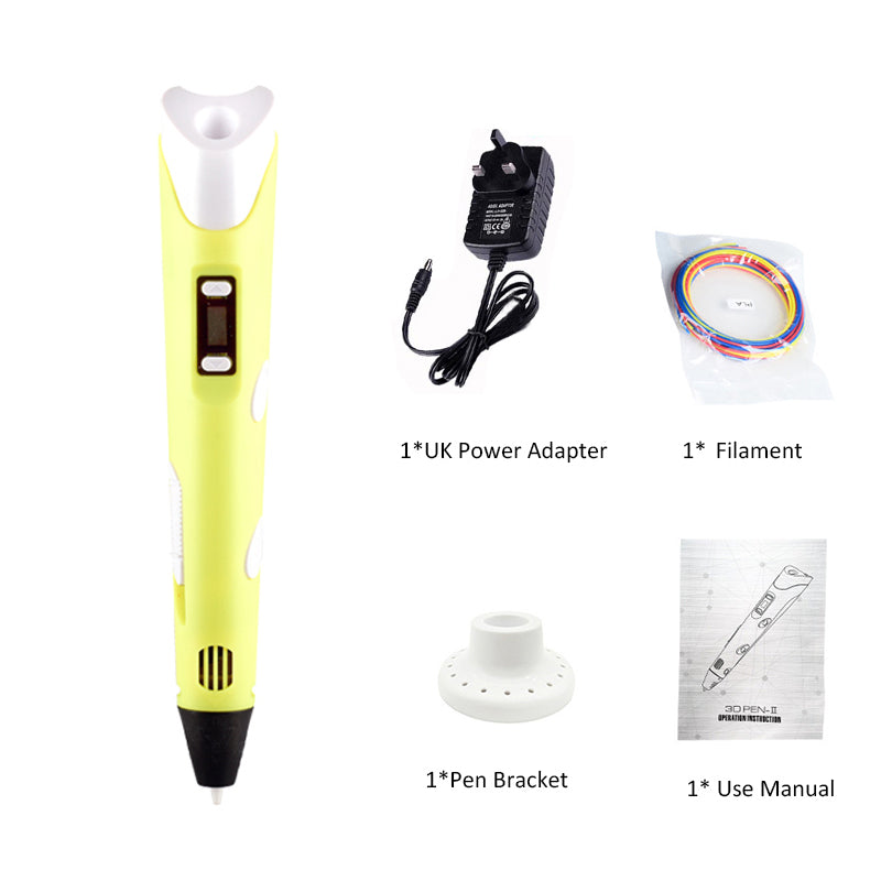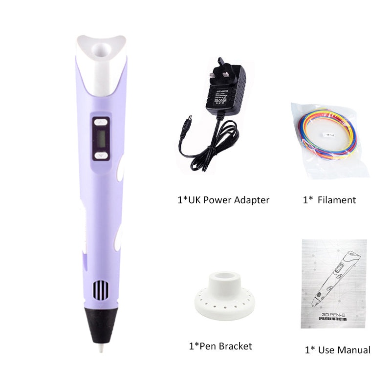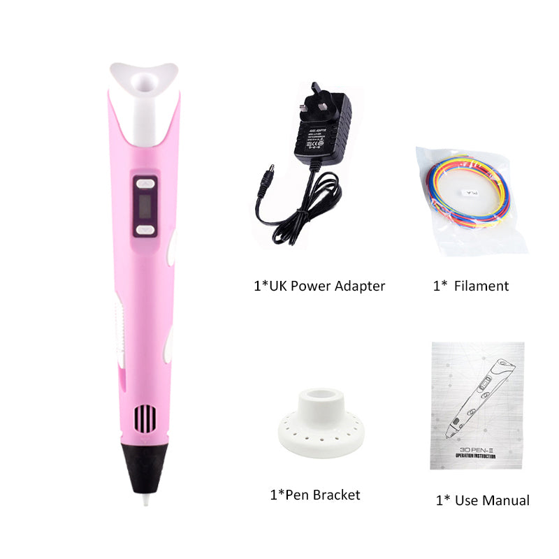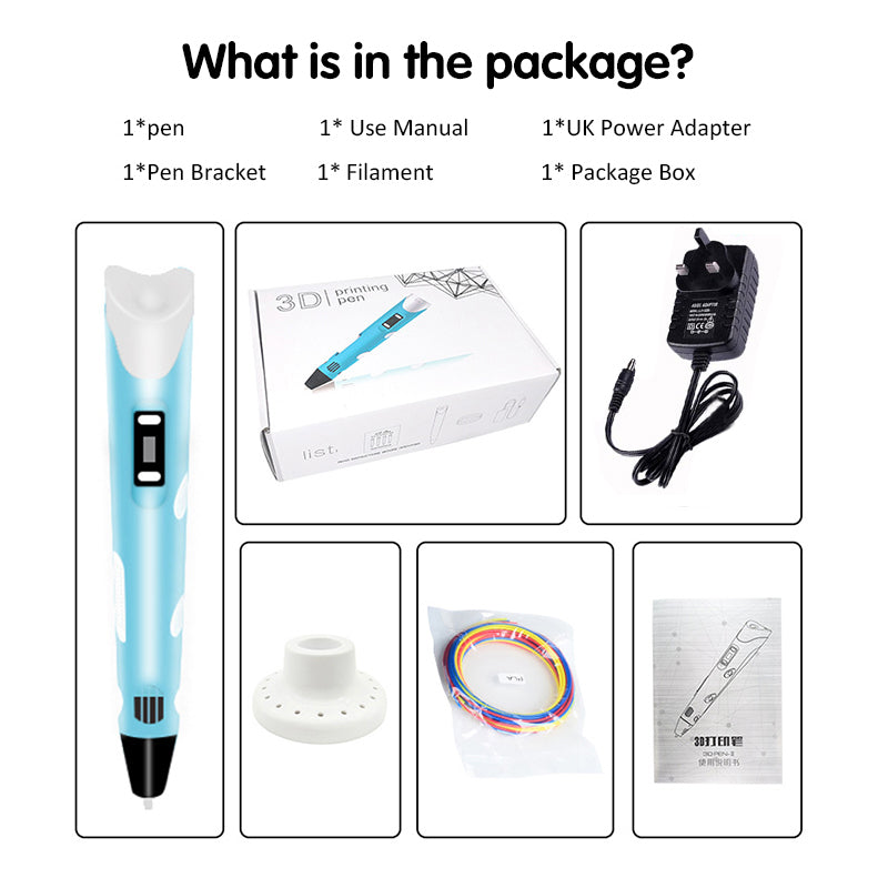 - Package Includes: 3D pen + USB cable + 3M 3-color consumables + manual + base (Note: UK 3-Pin USB Wall Charger is optional. You may add on this usb charger if you need it. Or you may use your existing USB charger but pls make sure it must be 5V 2A)