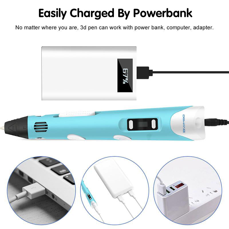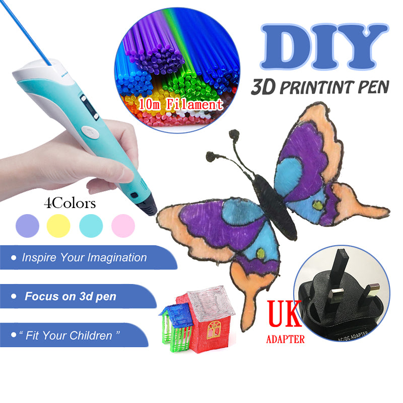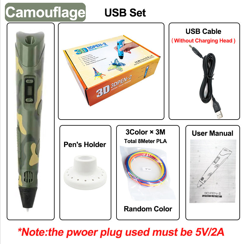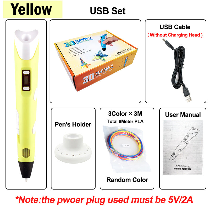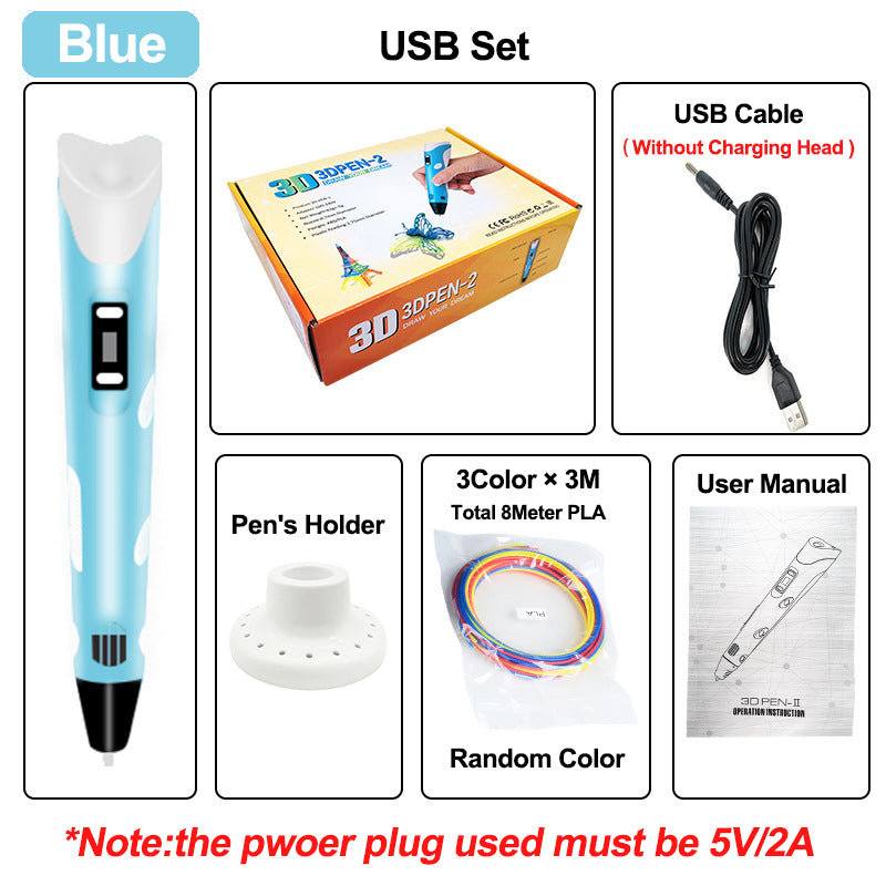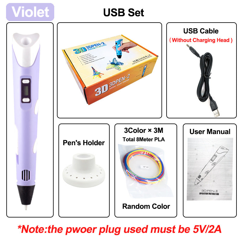 - Package Includes: 3D pen + USB cable + 3M 3-color consumables + manual + base (Note: UK 3-Pin USB Wall Charger is optional. You may add on this usb charger if you need it. Or you may use your existing USB charger but pls make sure it must be 5V 2A)