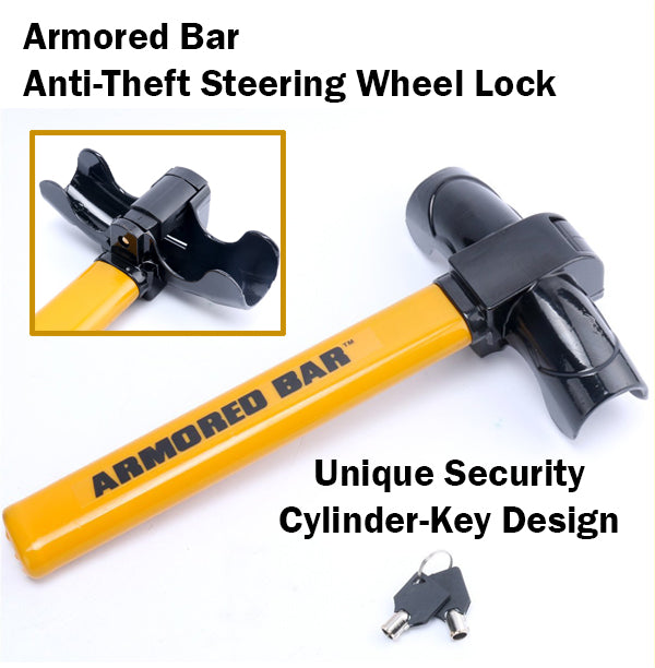 · 100% Brand New in Retail Box Packaging · High Quality · Armored Bar Anti-Theft Steering Wheel Lock · High visibility deters thieves · Tough steel construction · Vinyl coated to protect interior · Compact for easy storage · Unique Security Cylinder Key Design to prevent picking of locks! · Installs in seconds
