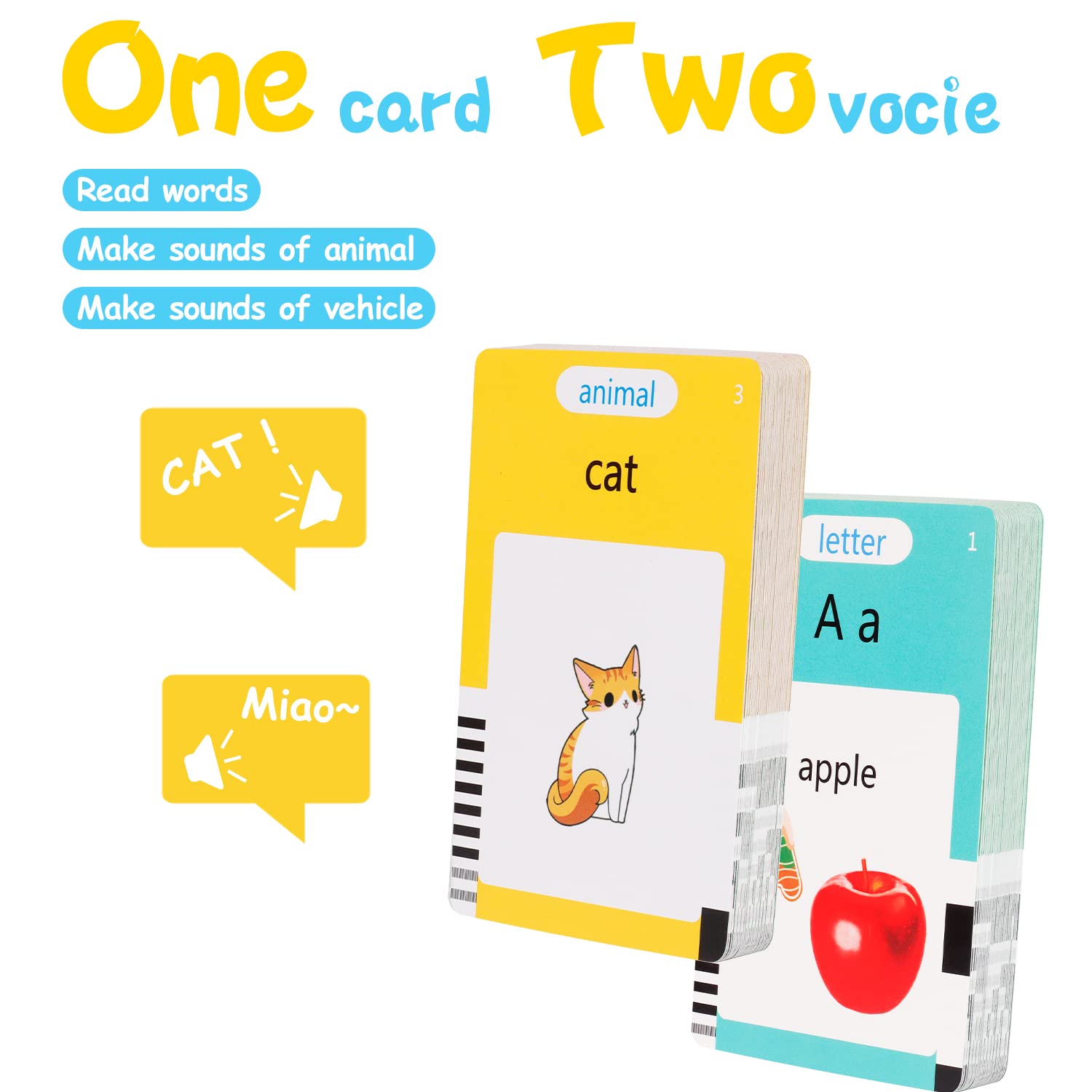 This talking flash cards for 2-6year olds has 112/255 cards, 224/510 knowledge points, Children can listen to the names and sounds of animals/transportation and read aloud with them. This is a great way for them to explore different possibilities, enhance their cognitive skills and exercise their hearing.