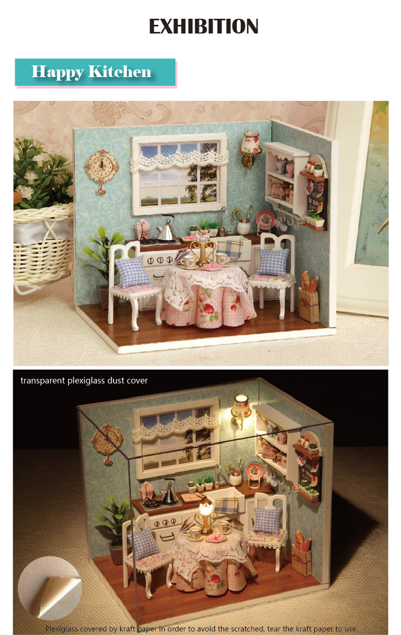 · 100% Brand New in Retail Box Packaging · High Quality · Cute Room Happiness Series Happy Kitchen · Model: H-008 (Happy Kitchen) · Package includes LED lights, transparent dust cover and battery box · Create your own happy kitchen model · After creating your model, it comes to live with lights lit on, and a transparent dust cover to protect your great model · Dust cover helps to store your model, and also prevent scratch or damages