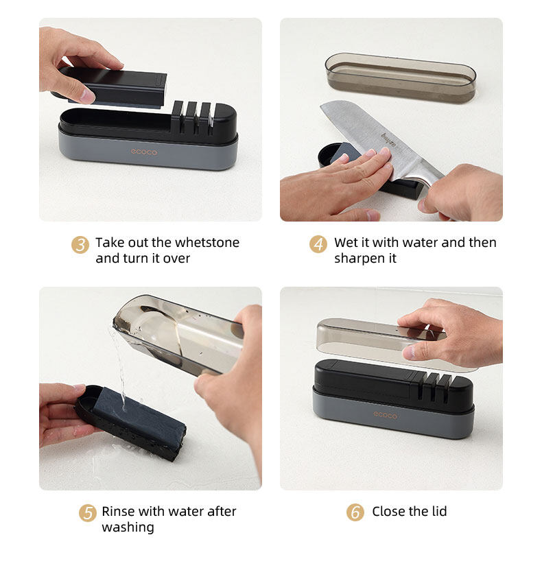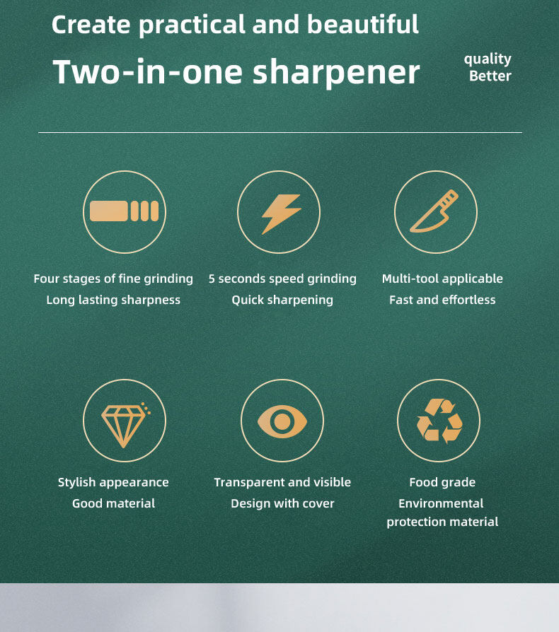 - Four-stage fine grinding, long-lasting sharpness;Quickly sharpen the knife in 5 seconds;Multi application, fast and labor-saving;Fashion appearance, excellent material;Transparent and visible, with cover design;Food grade, environmentally friendly material;