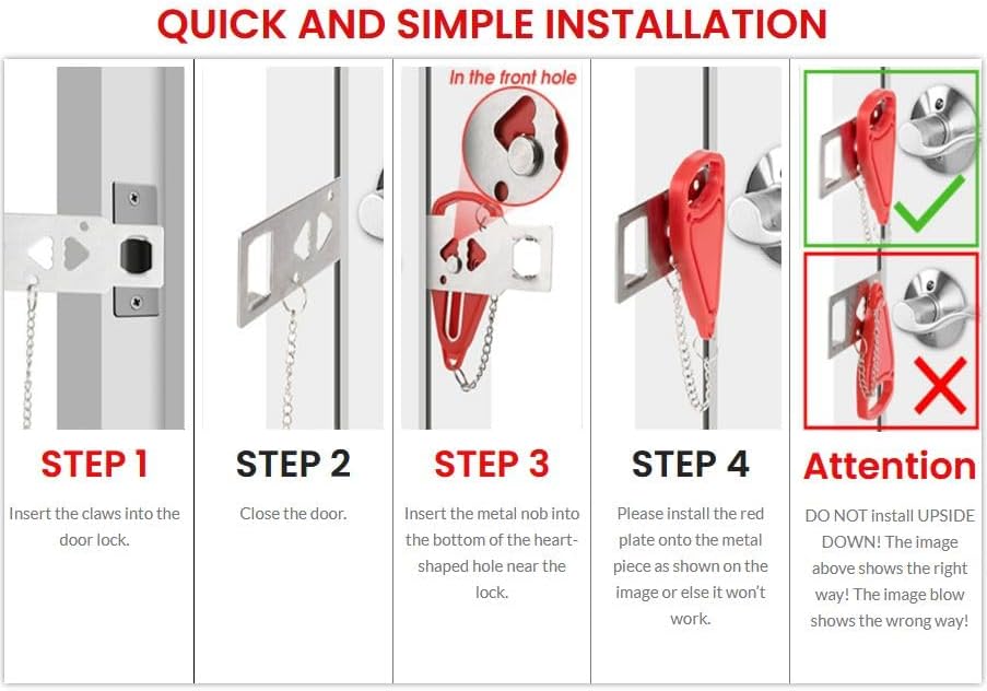 - EASY TO USE - Easy to install or remove, this door lock can be installed in seconds without any tools, even in emergency situations and in the dark. Just insert the metal piece into the slot of the door lock, close the door, and then put the red handle groove to the stud on the metal sheet, then no one can open the door from outside.